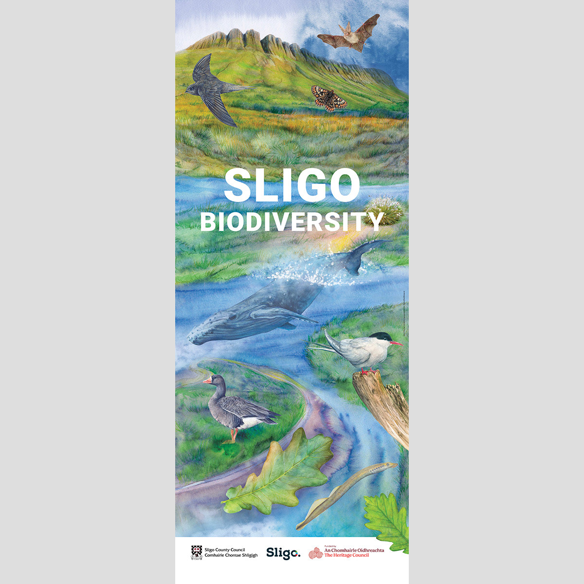 The illustration showcases a blend of iconic Sligo landscape and local wildlife, including Benbulben mountain, a brown long-eared bat, a marsh fritillary butterfly, a swift, a humpback whale, an Arctic tern, a Greenland white-fronted goose, a lamprey, grasslands and oak leaves.