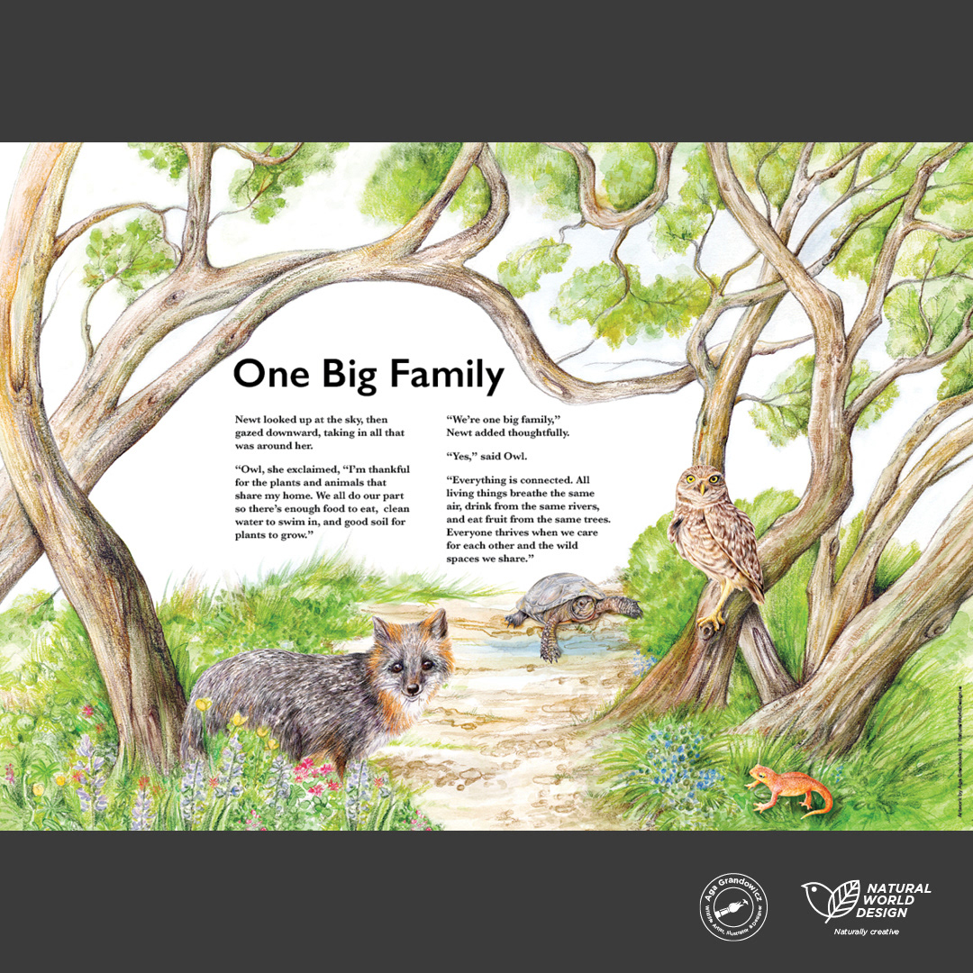 One Big Family – our latest wildlife project, completed for Curiodyssey in California, brings the state’s rich natural beauty to life through two meticulously crafted illustrated boards. These boards are designed to show the importance of every species that makes up our ecosystem, and to foster a deeper connection with nature.