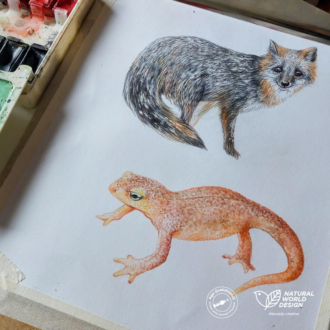 The first board is a mixed-media composition that seamlessly blends artistic illustration with photography. This board showcases a detailed portrayal of Californian woodland, featuring select native animal species –Western Pond Turtle/Pacific Pond Turtle, Burrowing Owl/shoco, Californian newt, and grey fox.